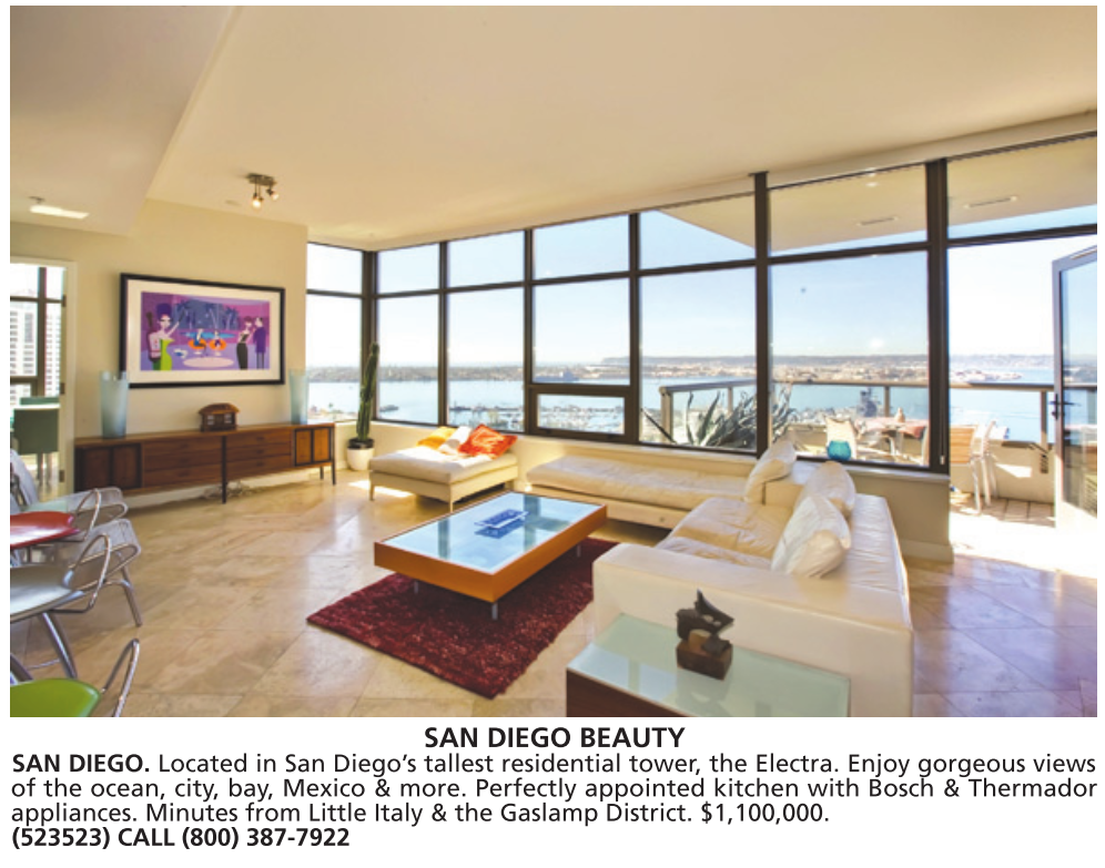 SAN DIEGO BEAUTY SAN DIEGO. Located in San Diego’s tallest residential tower, the Electra. Enjoy gorgeous views of the ocean, city, bay, Mexico & more. Perfectly appointed kitchen with Bosch & Thermador appliances. Minutes from Little Italy & the Gaslamp District. $1,100,000. (523523) CALL (800) 387-7922