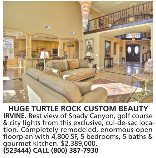 HUGE TURTLE ROCK CUSTOM BEAUTY IRVINE. Best view of Shady Canyon, golf course & city lights from this exclusive, cul-de-sac location. Completely remodeled, enormous open floorplan with 4,800 SF, 5 bedrooms, 5 baths & gourmet kitchen. $2,389,000. (523444) CALL (800) 387-7930