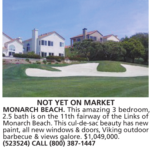 NOT YET ON MARKET MONARCH BEACH. This amazing 3 bedroom, 2.5 bath is on the 11th fairway of the Links of Monarch Beach. This cul-de-sac beauty has new paint, all new windows & doors, Viking outdoor barbecue & views galore. $1,049,000. (523524) CALL (800) 387-1447
