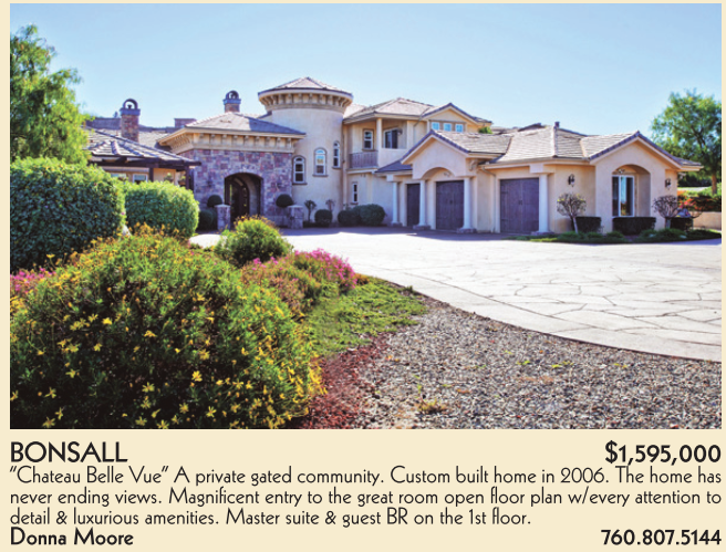 BONSALL $1,595,000 “Chateau Belle Vue” A private gated community. Custom built home in 2006. The home has never ending views. Magnificent entry to the great room open floor plan w/every attention to detail & luxurious amenities. Master suite & guest BR on the 1st floor. Donna Moore 760.807.5144