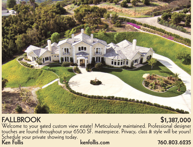 FALLBROOK $1,387,000 Welcome to your gated custom view estate! Meticulously maintained. Professional designer touches are found throughout your 6500 SF. masterpiece. Privacy, class & style will be yours! Schedule your private showing today. Ken Follis kenfollis.com 760.803.6235