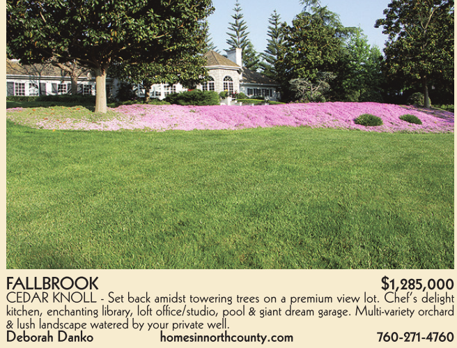 FALLBROOK $1,285,000 CEDAR KNOLL - Set back amidst towering trees on a premium view lot. Chef’s delight kitchen, enchanting library, loft office/studio, pool & giant dream garage. Multi-variety orchard & lush landscape watered by your private well. Deborah Danko homesinnorthcounty.com 760-271-4760
