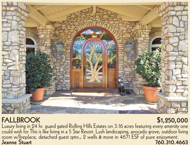 FALLBROOK $1,250,000 Luxury living in 24 hr. guard gated Rolling Hills Estates on 3.16 acres featuring every amenity one could wish for This is like living in a 5 Star Resort. Lush landscaping, avocado grove, outdoor living room w/fireplace, detached guest qrtrs., 2 wells & more in 4671 ESF of pure enjoyment. Jeanne Stuart 760.310.4663