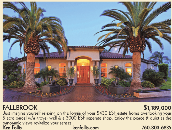 FALLBROOK $1,189,000 Just imagine yourself relaxing on the loggia of your 5430 ESF estate home overlooking your 5 acre parcel w/a grove, well & a 3000 ESF separate shop. Enjoy the peace & quiet as the panoramic views revitalize your senses. Ken Follis kenfollis.com 760.803.6235