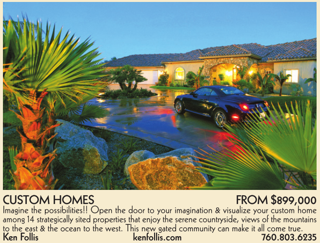 CUSTOM HOMES FROM $899,000 Imagine the possibilities!! Open the door to your imagination & visualize your custom home among 14 strategically sited properties that enjoy the serene countryside, views of the mountains to the east & the ocean to the west. This new gated community can make it all come true. Ken Follis kenfollis.com 760.803.6235