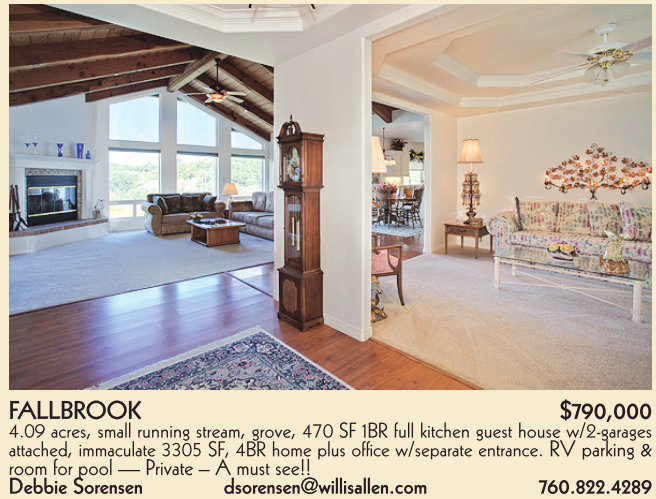 FALLBROOK $790,000 4.09 acres, small running stream, grove, 470 SF 1BR full kitchen guest house w/2-garages attached, immaculate 3305 SF, 4BR home plus office w/separate entrance. RV parking & room for pool — Private – A must see!! Debbie Sorensen dsorensen@willisallen.com 760.822.4289