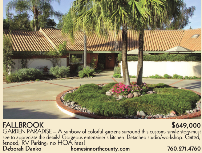 FALLBROOK $649,000 GARDEN PARADISE – A rainbow of colorful gardens surround this custom, single story-must see to appreciate the details! Gorgeous entertainer’s kitchen. Detached studio/workshop. Gated, fenced, RV Parking, no HOA fees! Deborah Danko homesinnorthcounty.com 760.271.4760