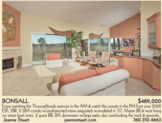 BONSALL $489,000 Enjoy watching the Thoroughbreds exercise in the AM & watch the sunsets in the PM from your 2668 ESF, 3BR. 2.5BA condo w/unobstructed views exquisitely re-modeled in ‘07. Master BR & most living on street level entry. 2 guest BR, BA downstairs w/large patio also overlooking the track & grounds. Jeanne Stuart jeannestuart.com 760.310.4663
