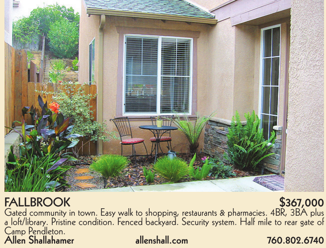 FALLBROOK $367,000 Gated community in town. Easy walk to shopping, restaurants & pharmacies. 4BR, 3BA plus a loft/library. Pristine condition. Fenced backyard. Security system. Half mile to rear gate of Camp Pendleton. Allen Shallahamer allenshall.com 760.802.6740