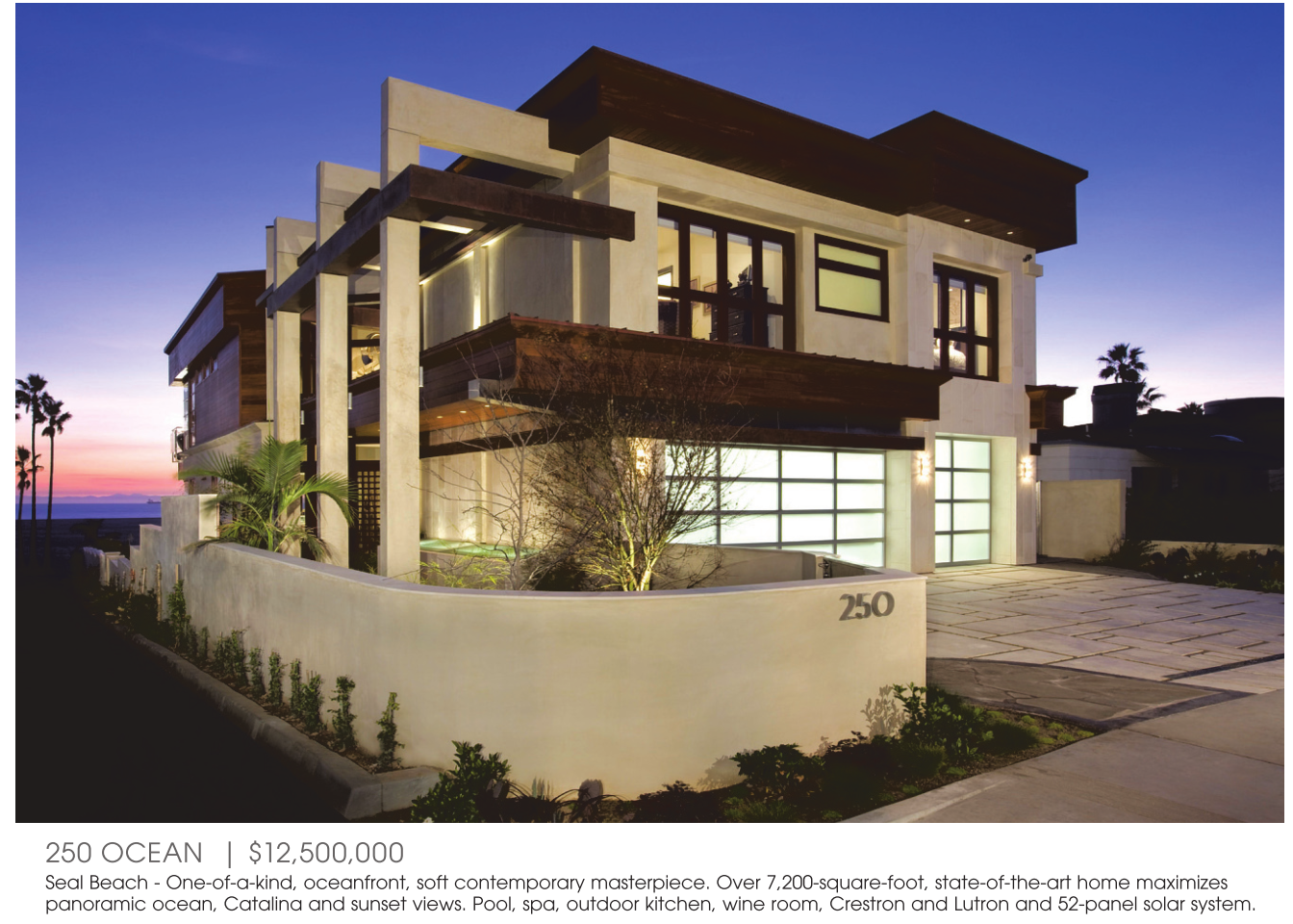 Seal Beach - One-of-a-kind, oceanfront, soft contemporary masterpiece. Over 7,200-square-foot, state-of-the-art home maximizes panoramic ocean, Catalina and sunset views. Pool, spa, outdoor kitchen, wine room, Crestron and Lutron and 52-panel solar system.