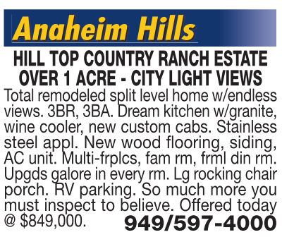HILL TOP COUNTRY RANCH ESTATE OVER 1 ACRE - CITY LIGHT VIEWS Total remodeled split level home w/endless views. 3BR, 3BA. Dream kitchen w/granite, wine cooler, new custom cabs. Stainless steel appl. New wood flooring, siding, AC unit. Multi-frplcs, fam rm, frml din rm. Upgds galore in every rm. Lg rocking chair porch. RV parking. So much more you must inspect to believe. Offered today @ $849,000. 949/597-4000