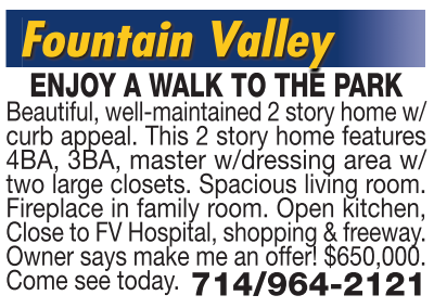 ENJOY A WALK TO THE PARK Beautiful, well-maintained 2 story home w/ curb appeal. This 2 story home features 4BA, 3BA, master w/dressing area w/ two large closets. Spacious living room. Fireplace in family room. Open kitchen, Close to FV Hospital, shopping & freeway. Owner says make me an offer! $650,000. Come see today. 714/964-2121
