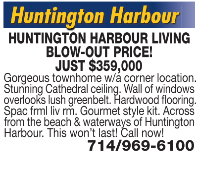 JUST $359,000 Gorgeous townhome w/a corner location. Stunning Cathedral ceiling. Wall of windows overlooks lush greenbelt. Hardwood flooring. Spac frml liv rm. Gourmet style kit. Across from the beach & waterways of Huntington Harbour. This won’t last! Call now!