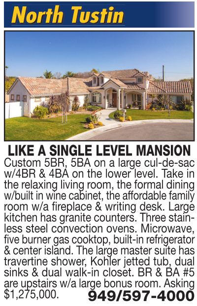LIKE A SINGLE LEVEL MANSION Custom 5BR, 5BA on a large cul-de-sac w/4BR & 4BA on the lower level. Take in the relaxing living room, the formal dining w/built in wine cabinet, the affordable family room w/a fireplace & writing desk. Large kitchen has granite counters. Three stainless steel convection ovens. Microwave, five burner gas cooktop, built-in refrigerator & center island. The large master suite has travertine shower, Kohler jetted tub, dual sinks & dual walk-in closet. BR & BA #5 are upstairs w/a large bonus room. Asking $1,275,000. 949/597-4000