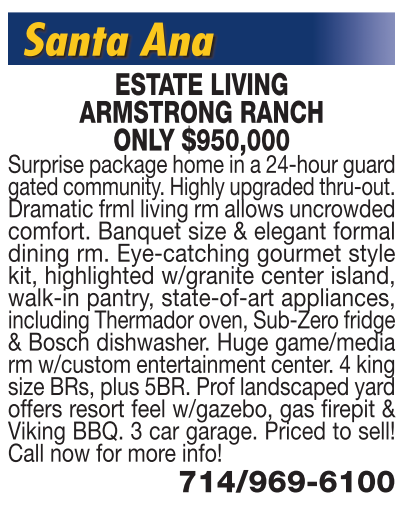 Santa Ana ESTATE LIVING ARMSTRONG RANCH ONLY $950,000 Surprise package home in a 24-hour guard gated community. Highly upgraded thru-out. Dramatic frml living rm allows uncrowded comfort. Banquet size & elegant formal dining rm. Eye-catching gourmet style kit, highlighted w/granite center island, walk-in pantry, state-of-art appliances, including Thermador oven, Sub-Zero fridge & Bosch dishwasher. Huge game/media rm w/custom entertainment center. 4 king size BRs, plus 5BR. Prof landscaped yard offers resort feel w/gazebo, gas firepit & Viking BBQ. 3 car garage. Priced to sell! Call now for more info! 714/969-6100