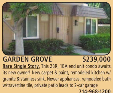 GARDEN GROVE $239,000 Rare Single Story. This 2BR, 1BA end unit condo awaits