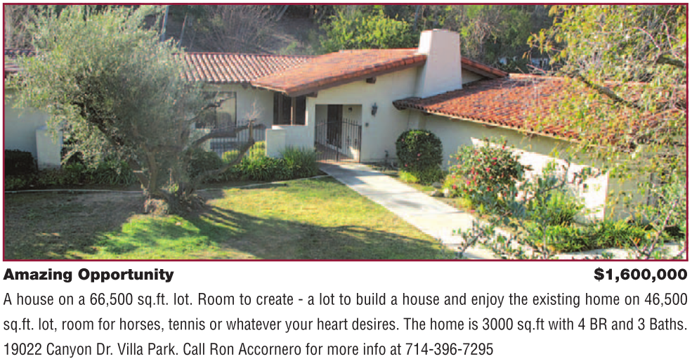 Amazing Opportunity $1,600,000 A house on a 66,500 sq.ft. lot. Room to create - a lot to build a house and enjoy the existing home on 46,500 sq.ft. lot, room for horses, tennis or whatever your heart desires. The home is 3000 sq.ft with 4 BR and 3 Baths. 19022 Canyon Dr. Villa Park. Call Ron Accornero for more info at 714-396-7295