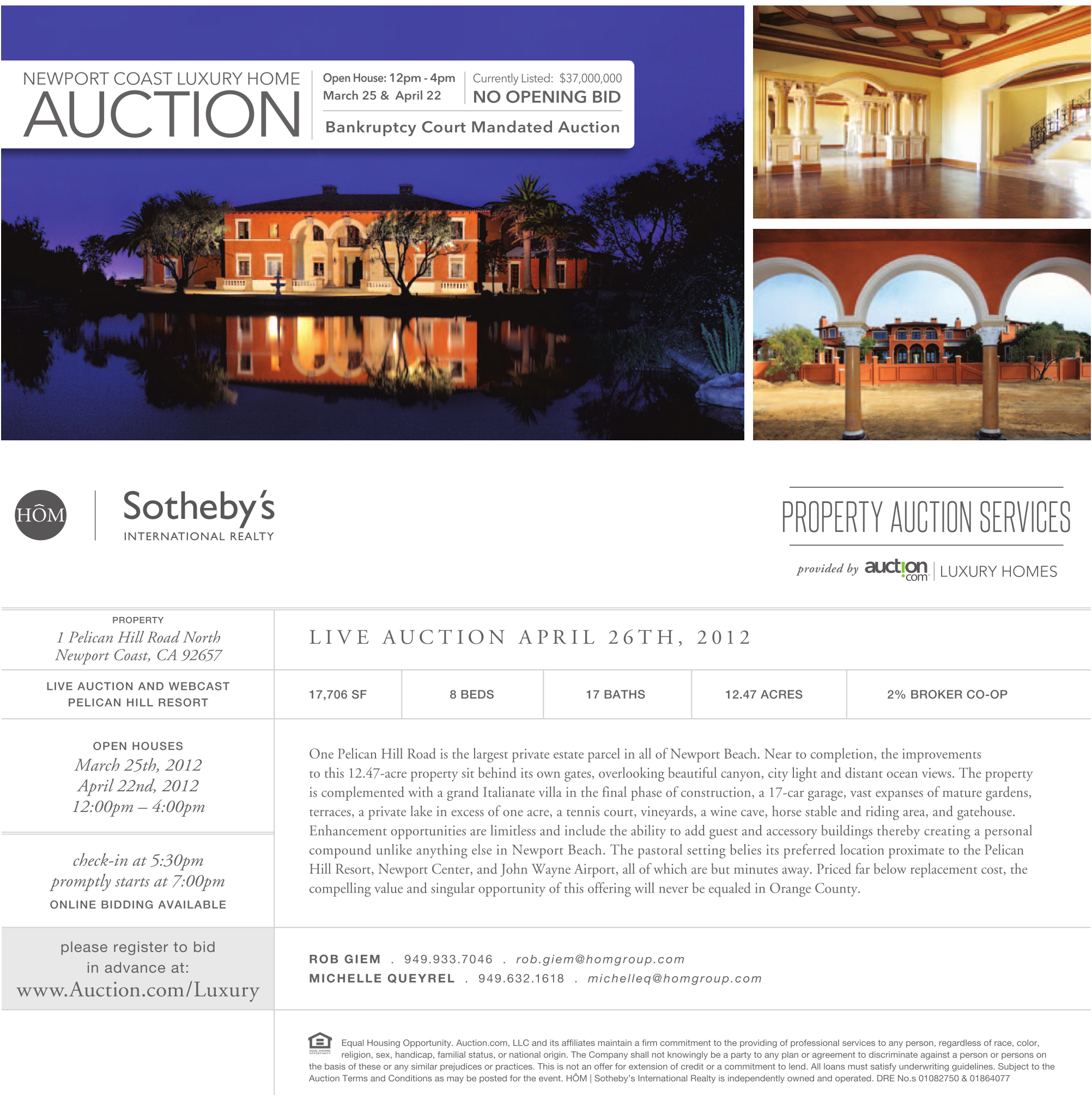 NEWPORT COAST LUXURY HOME Open House: 12pm - 4pm Currently Listed: $37,000,000 March 25 & April 22 NO OPENING BID