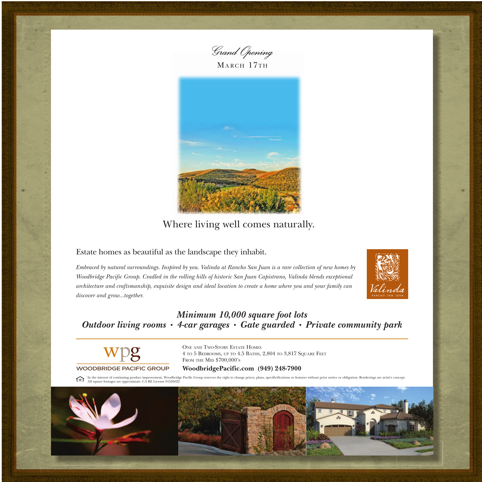 Embraced by natural surroundings. Inspired by you. Valinda at Rancho San Juan is a rare collection of new homes by Woodbridge Pacific Group. Cradled in the rolling hills of historic San Juan Capistrano, Valinda blends exceptional architecture and craftsmanship, exquisite design and ideal location to create a home where you and your family can discover and grow…together.