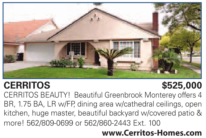CERRITOS $525,000 CERRITOS BEAUTY! Beautiful Greenbrook Monterey offers 4 BR, 1.75 BA, LR w/FP, dining area w/cathedral ceilings, open kitchen, huge master, beautiful backyard w/covered patio & more! 562/809-0699 or 562/860-2443 Ext. 100 www.Cerritos-Homes.com