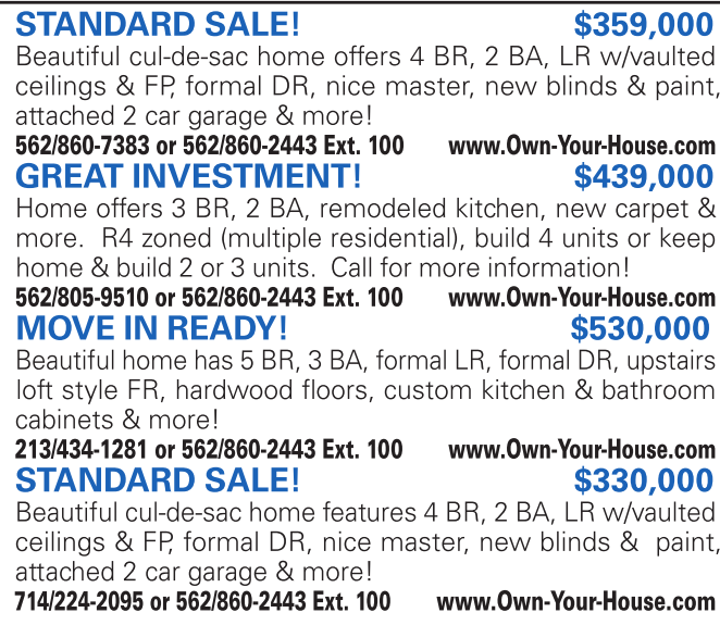 562/860-7383 or 562/860-2443 Ext. 100 www.Own-Your-House.com GREAT INVESTMENT! $439,000