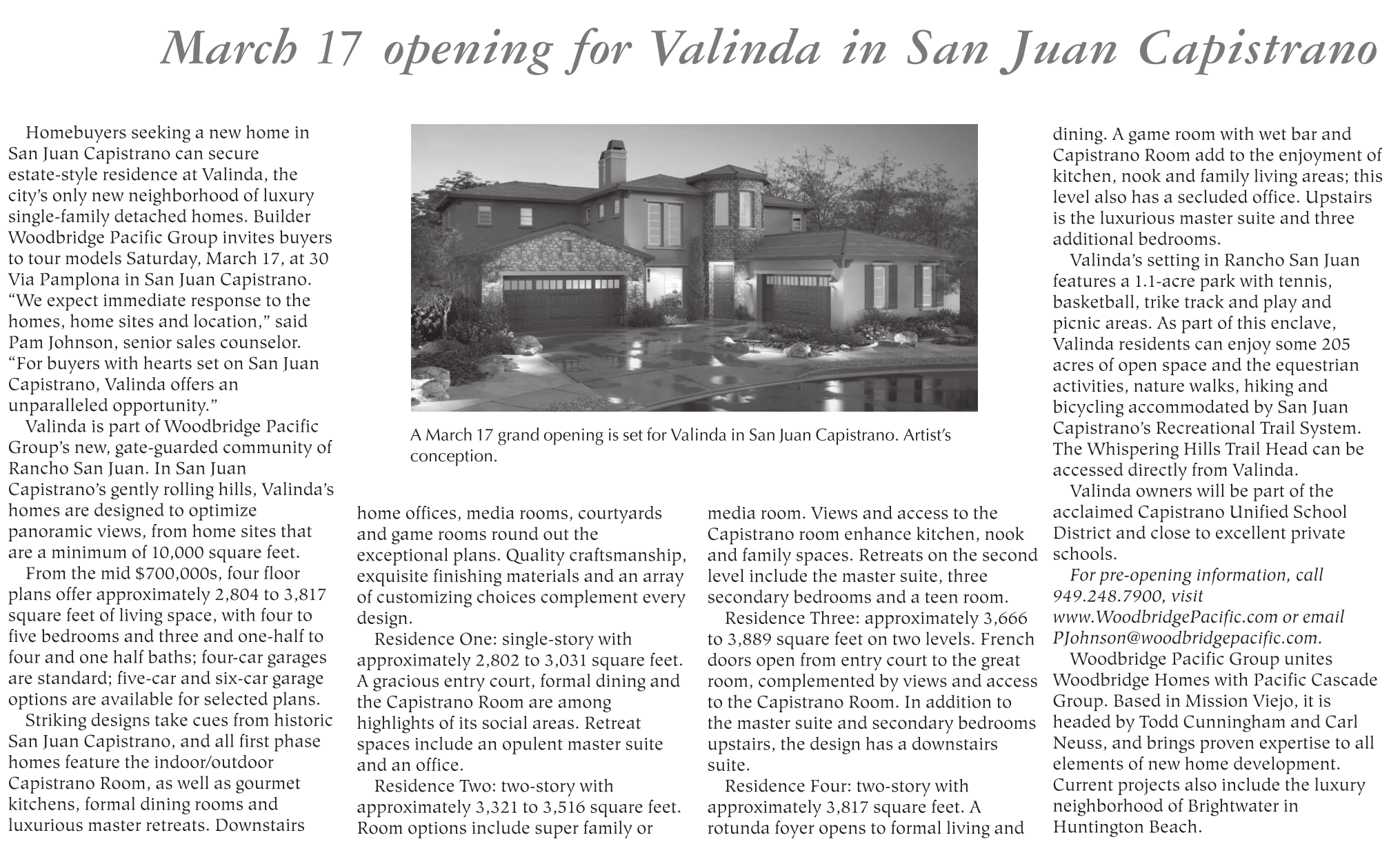 Homebuyers seeking a new home in San Juan Capistrano can secure estate-style residence at Valinda, the city’s only new neighborhood of luxury single-family detached homes. Builder Woodbridge Pacific Group invites buyers to tour models Saturday, March 17, at 30 Via Pamplona in San Juan Capistrano. “We expect immediate response to the homes, home sites and location,” said Pam Johnson, senior sales counselor. “For buyers with hearts set on San Juan Capistrano, Valinda offers an unparalleled opportunity.”