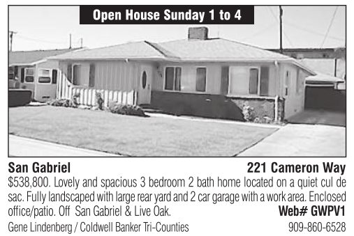 San Gabriel 221 Cameron Way $538,800. Lovely and spacious 3 bedroom 2 bath home located on a quiet cul de sac. Fully landscaped with large rear yard and 2 car garage with a work area. Enclosed office/patio. Off San Gabriel & Live Oak. Web# GWPV1 Gene Lindenberg / Coldwell Banker Tri-Counties 909-860-6528
