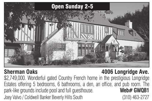 Sherman Oaks 4006 Longridge Ave. $2,749,000. Wonderful gated Country French home in the prestigious Longridge Estates offering 5 bedrooms, 6 bathrooms, a den, an office, and pub room. The park-like grounds include pool and full guesthouse. Web# GWQB1