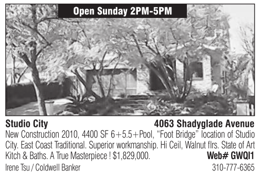 Studio City 4063 Shadyglade Avenue New Construction 2010, 4400 SF 6+5.5+Pool, “Foot Bridge” location of Studio City. East Coast Traditional. Superior workmanship. Hi Ceil, Walnut flrs. State of Art Kitch & Baths. A True Masterpiece ! $1,829,000. Web# GWQI1