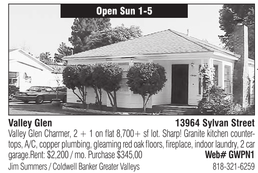 Valley Glen 13964 Sylvan Street Valley Glen Charmer,2+1onflat8,700+ sf lot. Sharp! Granite kitchen countertops, A/C, copper plumbing, gleaming red oak floors, fireplace, indoor laundry, 2 car garage.Rent: $2,200 / mo. Purchase $345,00 Web# GWPN1