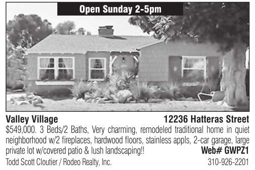 Valley Village 12236 Hatteras Street $549,000. 3 Beds/2 Baths, Very charming, remodeled traditional home in quiet neighborhood w/2 fireplaces, hardwood floors, stainless appls, 2-car garage, large private lot w/covered patio & lush landscaping!! Web# GWPZ1 Todd Scott Cloutier / Rodeo Realty, Inc. 310-926-2201