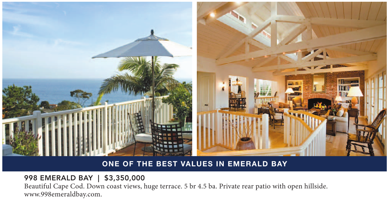998 EMERALD BAY | $3,350,000 Beautiful Cape Cod. Down coast views, huge terrace. 5 br 4.5 ba. Private rear patio with open hillside. www.998emeraldbay.com.