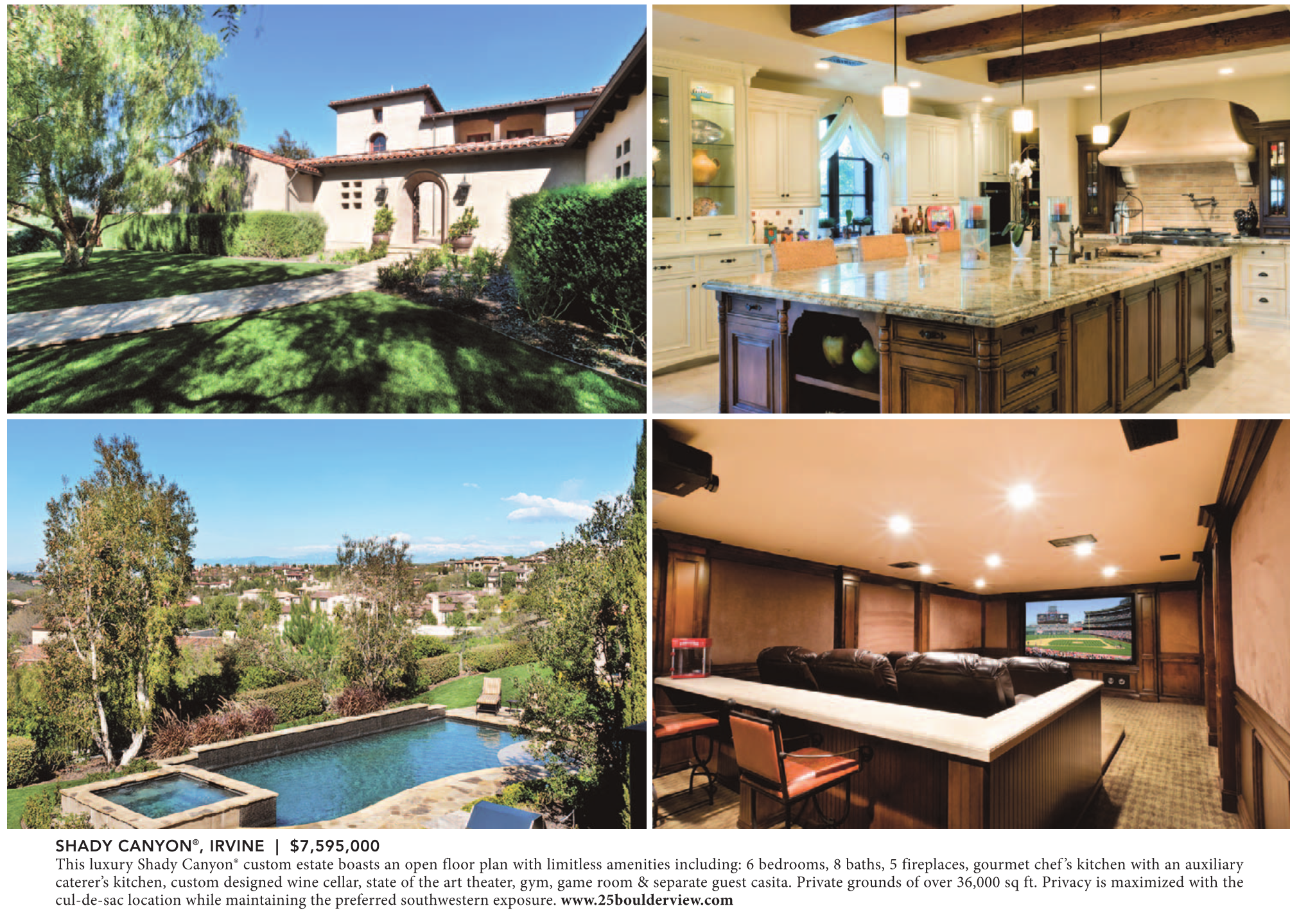 SHADY CANYON ® , IRVINE | $7,595,000 This luxury Shady Canyon® custom estate boasts an open floor plan with limitless amenities including: 6 bedrooms, 8 baths, 5 fireplaces, gourmet chef ’s kitchen with an auxiliary caterer’s kitchen, custom designed wine cellar, state of the art theater, gym, game room & separate guest casita. Private grounds of over 36,000 sq ft. Privacy is maximized with the cul-de-sac location while maintaining the preferred southwestern exposure. www.25boulderview.com