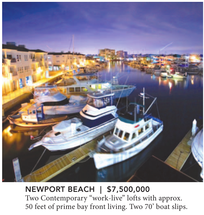 NEWPORT BEACH | $7,500,000 Two Contemporary “work-live” lofts with approx. 50 feet of prime bay front living. Two 70’ boat slips.