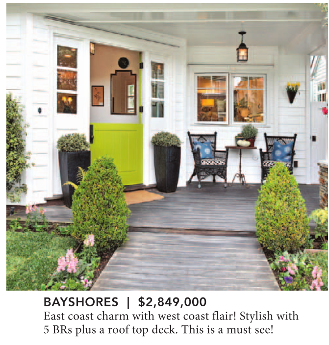 BAYSHORES | $2,849,000 East coast charm with west coast flair! Stylish with 5 BRs plus a roof top deck. This is a must see!