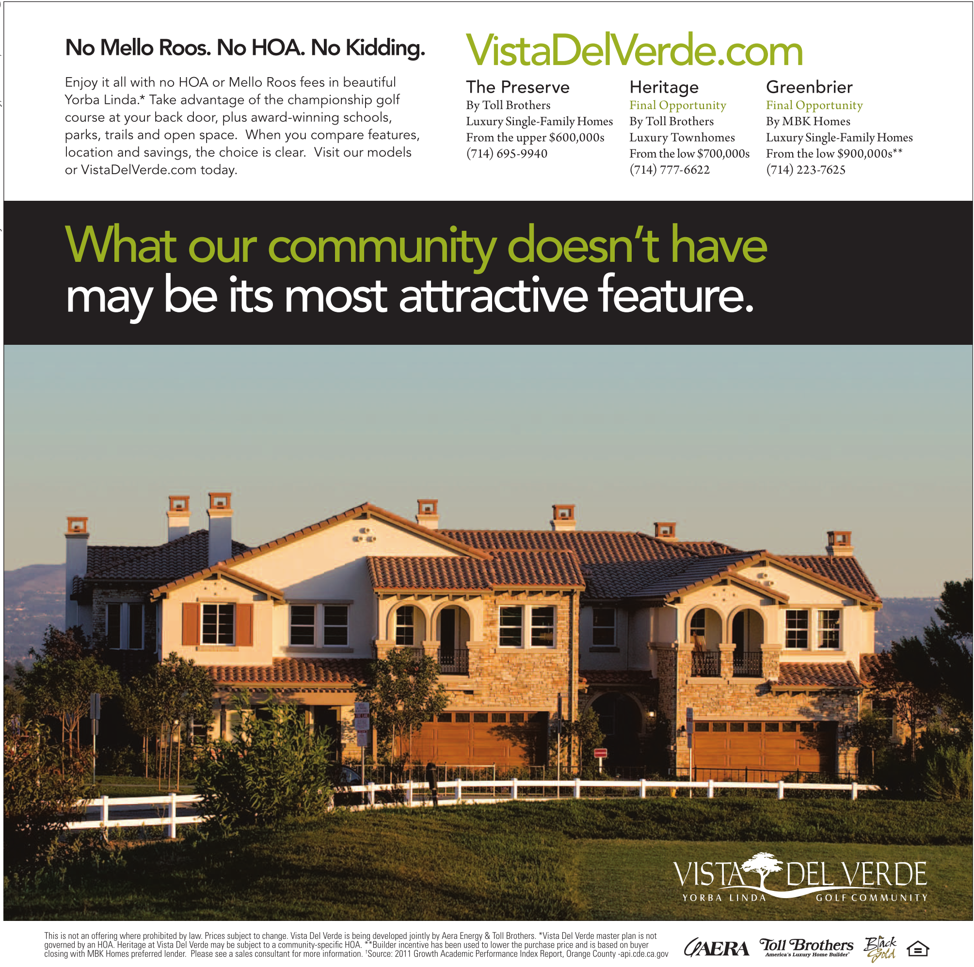 20 No Mello Roos. No HOA. No Kidding. Enjoy it all with no HOA or Mello Roos fees in beautiful Yorba Linda.* Take advantage of the championship golf course at your back door, plus award-winning schools, parks, trails and open space. When you compare features, location and savings, the choice is clear. Visit our models or VistaDelVerde.com today. VistaDelVerde.com The Preserve By Toll Brothers Luxury Single-Family Homes From the upper $600,000s (714) 695-9940 Heritage Final Opportunity By Toll Brothers Luxury Townhomes From the low $700,000s (714) 777-6622 Greenbrier Final Opportunity By MBK Homes Luxury Single-Family Homes From the low $900,000s** (714) 223-7625 What our community doesn’t have may be its most attractive feature. This is not an offering where prohibited by law. Prices subject to change. Vista Del Verde is being developed jointly by Aera Energy & Toll Brothers. *Vista Del Verde master plan is not governed by an HOA. Heritage at Vista Del Verde may be subject to a community-specific HOA. **Builder incentive has been used to lower the purchase price and is based on buyer closing with MBK Homes preferred lender. Please see a sales consultant for more information. † Source: 2011 Growth Academic Performance Index Report, Orange County -api.cde.ca.gov