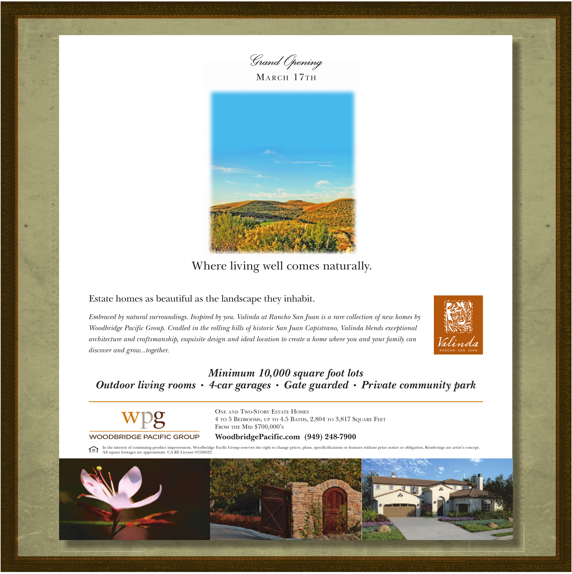 Grand Opening M ARCH 17TH Where living well comes naturally. Estate homes as beautiful as the landscape they inhabit. Embraced by natural surroundings. Inspired by you. Valinda at Rancho San Juan is a rare collection of new homes by Woodbridge Pacific Group. Cradled in the rolling hills of historic San Juan Capistrano, Valinda blends exceptional architecture and craftsmanship, exquisite design and ideal location to create a home where you and your family can discover and grow…together. Minimum 10,000 square foot lots Outdoor living rooms • 4-car garages • Gate guarded • Private community park wpg ONE AND TWO-STORY ESTATE HOMES 4 TO 5 BEDROOMS, UP TO 4.5 BATHS, 2,804 TO 3,817 SQUARE FEET FROM THE MID $700,000’S WOODBRIDGE PACIFIC GROUP WoodbridgePacific.com (949) 248-7900 In the interest of continuing product improvement, Woodbridge Pacific Group reserves the right to change prices, plans, specificifications or features without prior notice or obligation. Renderings are artist’s concept. All square footages are approximate. CA RE License 01526622