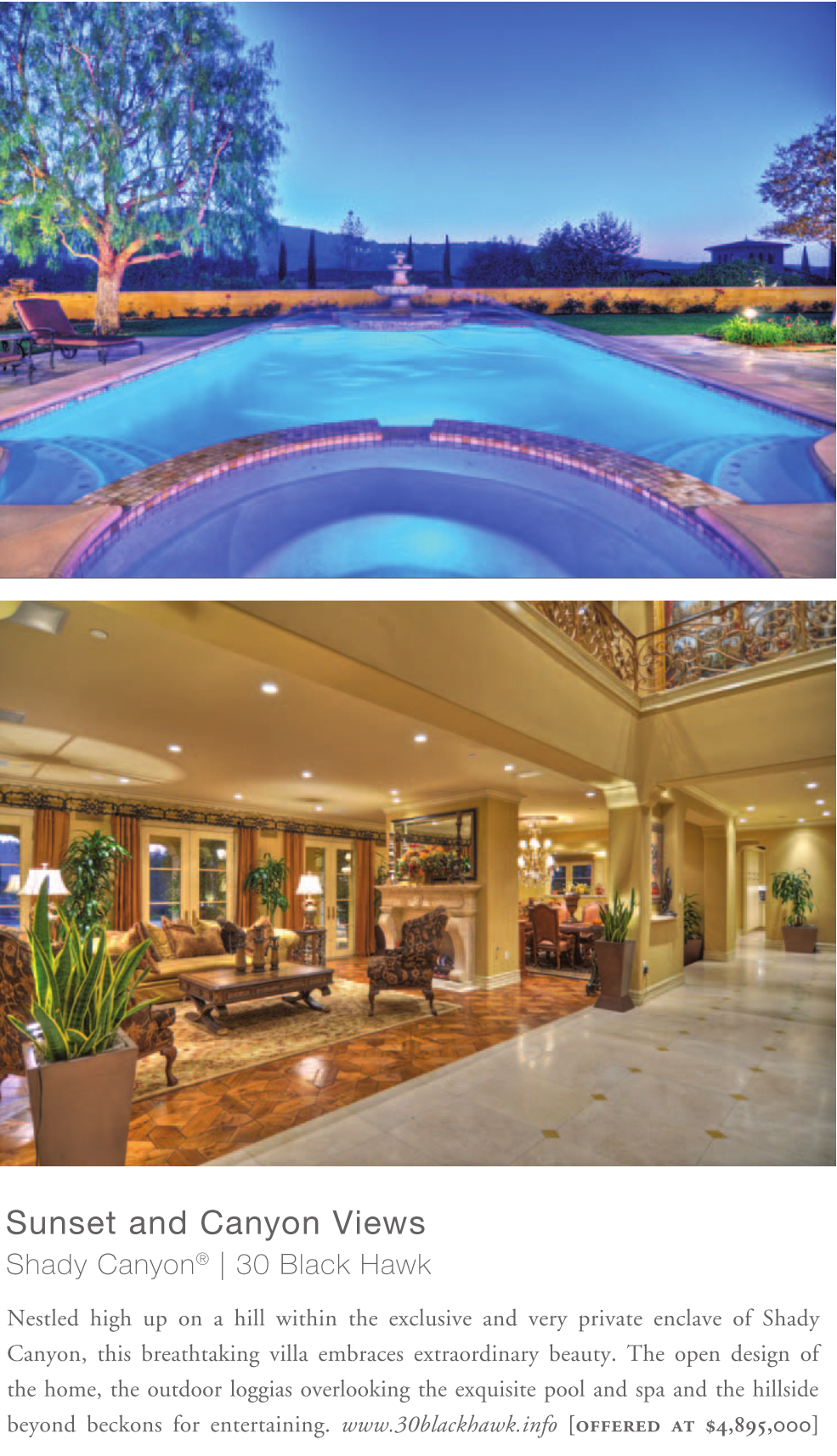 Sunset and Canyon Views Shady Canyon ® | 30 Black Hawk Nestled high up on a hill within the exclusive and very private enclave of Shady Canyon, this breathtaking villa embraces extraordinary beauty. The open design of the home, the outdoor loggias overlooking the exquisite pool and spa and the hillside beyond beckons for entertaining. www.30blackhawk.info [offered at $4,895,000]