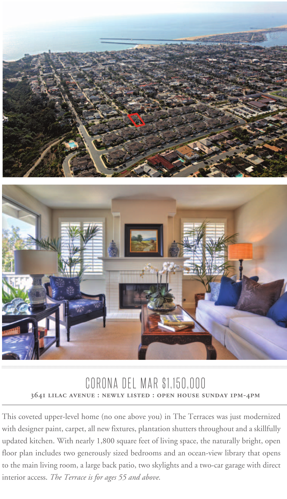 CORONA DEL MAR $1,150,000 3641 lilac avenue : newly listed : open house sunday 1pm-4pm This coveted upper-level home (no one above you) in The Terraces was just modernized with designer paint, carpet, all new fixtures, plantation shutters throughout and a skillfully updated kitchen. With nearly 1,800 square feet of living space, the naturally bright, open floor plan includes two generously sized bedrooms and an ocean-view library that opens to the main living room, a large back patio, two skylights and a two-car garage with direct interior access. The Terrace is for ages 55 and above.