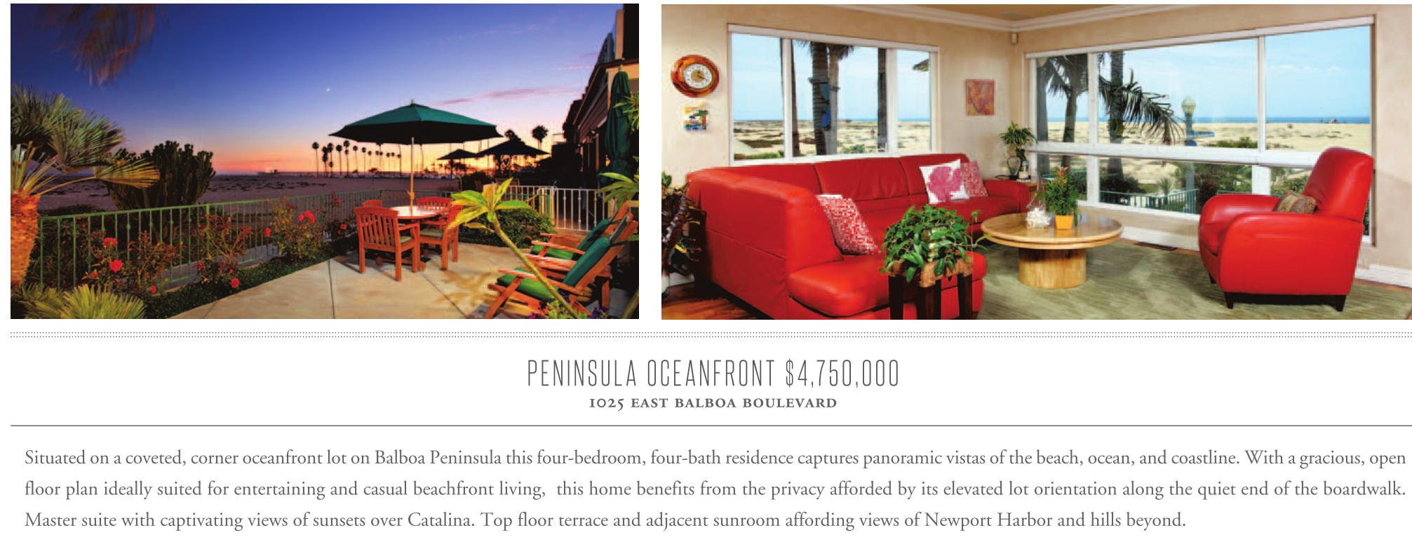 PENINSULA OCEANFRONT $4,750,000 1025 east balboa boulevard Situated on a coveted, corner oceanfront lot on Balboa Peninsula this four-bedroom, four-bath residence captures panoramic vistas of the beach, ocean, and coastline. With a gracious, open floor plan ideally suited for entertaining and casual beachfront living, this home benefits from the privacy afforded by its elevated lot orientation along the quiet end of the boardwalk. Master suite with captivating views of sunsets over Catalina. Top floor terrace and adjacent sunroom affording views of Newport Harbor and hills beyond.