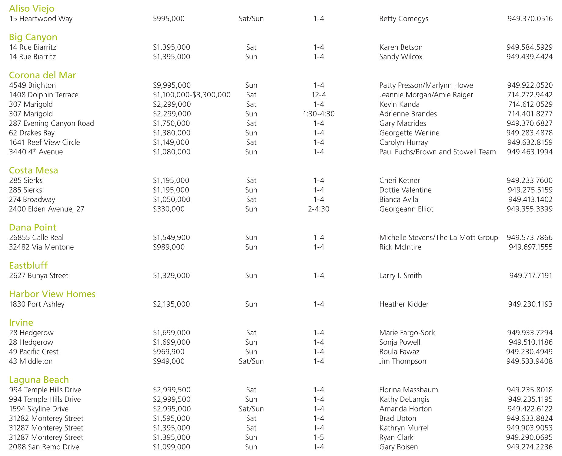 Aliso Viejo 15 Heartwood Way $995,000 Sat/Sun 1-4 Betty Comegys 949.370.0516 Big Canyon 14 Rue Biarritz $1,395,000 Sat 1-4 Karen Betson 949.584.5929 14 Rue Biarritz $1,395,000 Sun 1-4 Sandy Wilcox 949.439.4424 Corona del Mar 4549 Brighton $9,995,000 Sun 1-4 Patty Presson/Marlynn Howe 949.922.0520 1408 Dolphin Terrace $1,100,000-$3,300,000 Sat 12-4 Jeannie Morgan/Amie Raiger 714.272.9442 307 Marigold $2,299,000 Sat 1-4 Kevin Kanda 714.612.0529 307 Marigold $2,299,000 Sun 1:30-4:30 Adrienne Brandes 714.401.8277 287 Evening Canyon Road $1,750,000 Sat 1-4 Gary Macrides 949.370.6827 62 Drakes Bay $1,380,000 Sun 1-4 Georgette Werline 949.283.4878 1641 Reef View Circle $1,149,000 Sat 1-4 Carolyn Hurray 949.632.8159 3440 4 th Avenue $1,080,000 Sun 1-4 Paul Fuchs/Brown and Stowell Team 949.463.1994 Costa Mesa 285 Sierks $1,195,000 Sat 1-4 Cheri Ketner 949.233.7600 285 Sierks $1,195,000 Sun 1-4 Dottie Valentine 949.275.5159 274 Broadway $1,050,000 Sat 1-4 Bianca Avila 949.413.1402 2400 Elden Avenue, 27 $330,000 Sun 2-4:30 Georgeann Elliot 949.355.3399 Dana Point 26855 Calle Real $1,549,900 Sun 1-4 Michelle Stevens/The La Mott Group 949.573.7866 32482 Via Mentone $989,000 Sun 1-4 Rick McIntire 949.697.1555 Eastbluff 2627 Bunya Street $1,329,000 Sun 1-4 Larry I. Smith 949.717.7191 Harbor View Homes 1830 Port Ashley $2,195,000 Sun 1-4 Heather Kidder 949.230.1193 Irvine 28 Hedgerow $1,699,000 Sat 1-4 Marie Fargo-Sork 949.933.7294 28 Hedgerow $1,699,000 Sun 1-4 Sonja Powell 949.510.1186 49 Pacific Crest $969,900 Sun 1-4 Roula Fawaz 949.230.4949 43 Middleton $949,000 Sat/Sun 1-4 Jim Thompson 949.533.9408 Laguna Beach 994 Temple Hills Drive $2,999,500 Sat 1-4 Florina Massbaum 949.235.8018 994 Temple Hills Drive $2,999,500 Sun 1-4 Kathy DeLangis 949.235.1195 1594 Skyline Drive $2,995,000 Sat/Sun 1-4 Amanda Horton 949.422.6122 31282 Monterey Street $1,595,000 Sat 1-4 Brad Upton 949.633.8824 31287 Monterey Street $1,395,000 Sat 1-4 Kathryn Murrel 949.903.9053 31287 Monterey Street $1,395,000 Sun 1-5 Ryan Clark 949.290.0695 2088 San Remo Drive $1,099,000 Sun 1-4 Gary Boisen 949.274.2236