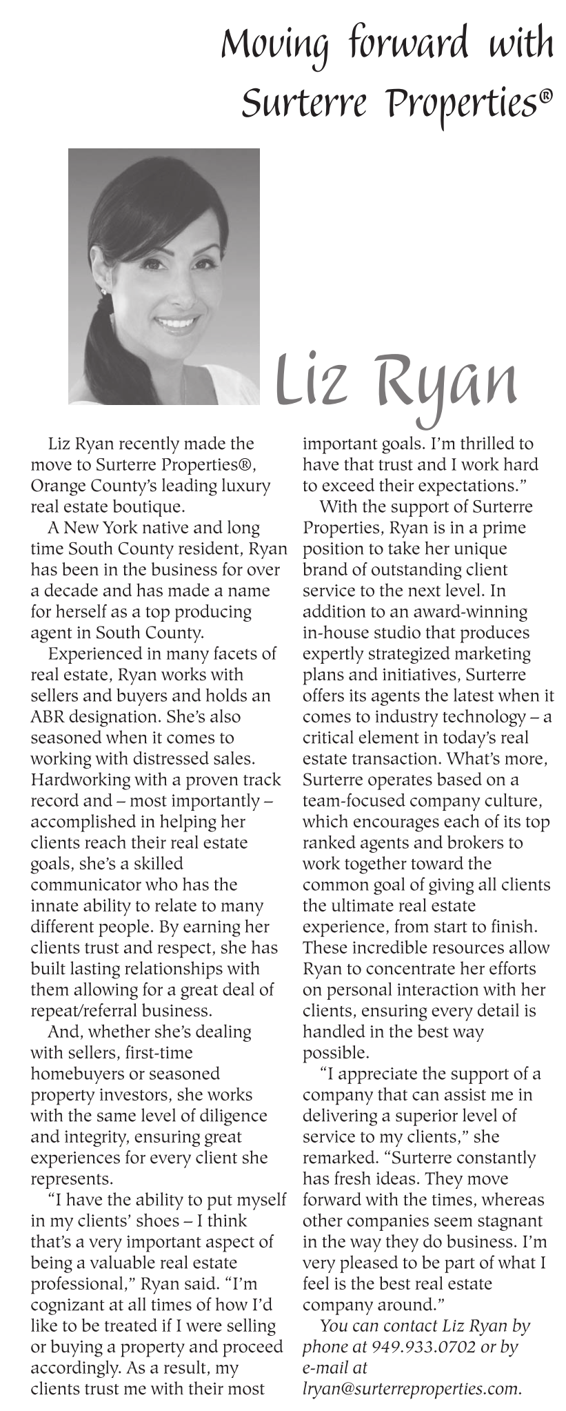 Liz Ryan recently made the move to Surterre Properties®, Orange County’s leading luxury real estate boutique.