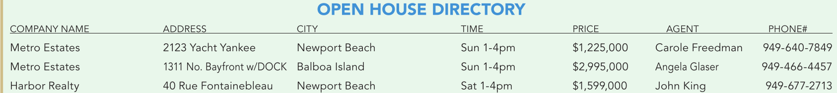 COMPANY NAME ADDRESS CITY TIME PRICE AGENT PHONE# Metro Estates 2123 Yacht Yankee Newport Beach Sun 1-4pm $1,225,000 Carole Freedman 949-640-7849 Metro Estates 1311 No. Bayfront w/DOCK Balboa Island Sun 1-4pm $2,995,000 Angela Glaser 949-466-4457 Harbor Realty 40 Rue Fontainebleau Newport Beach Sat 1-4pm $1,599,000 John King 949-677-2713