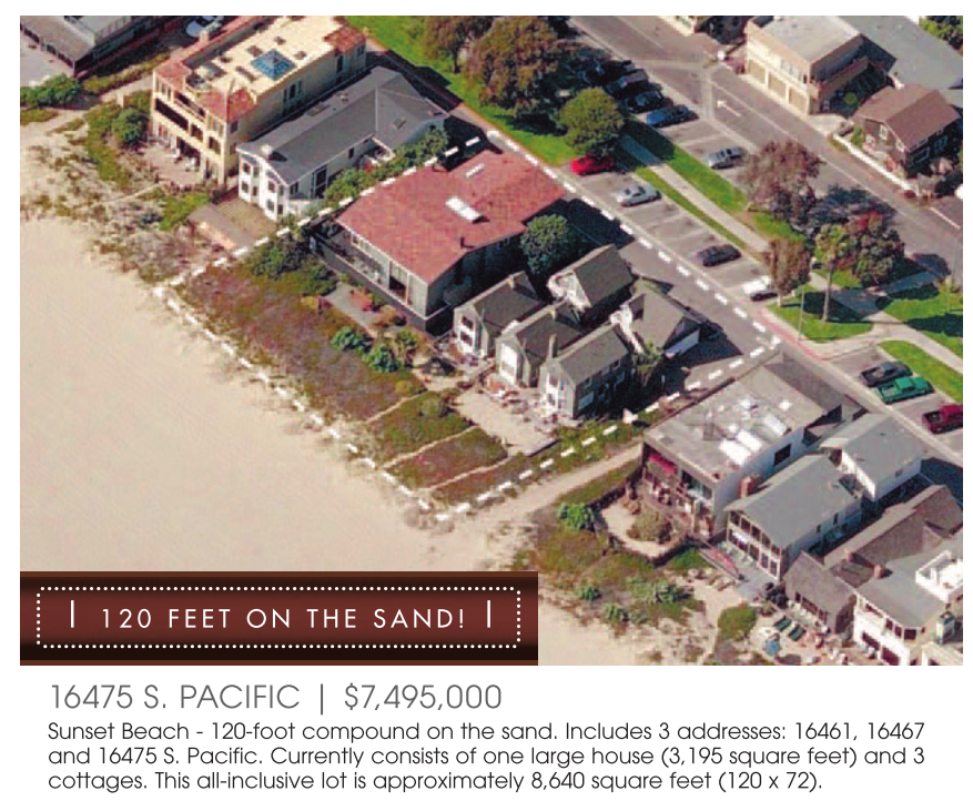 | 120 FEET ON THE SAND! | 16475 S. PACIFIC | $7,495,000 Sunset Beach - 120-foot compound on the sand. Includes 3 addresses: 16461, 16467 and 16475 S. Pacific. Currently consists of one large house (3,195 square feet) and 3 cottages. This all-inclusive lot is approximately 8,640 square feet (120 x 72).