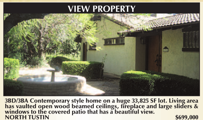 3BD/3BA Contemporary style home on a huge 33,825 SF lot. Living area has vaulted open wood beamed ceilings, fireplace and large sliders & windows to the covered patio that has a beautiful view. NORTH TUSTIN $699,000