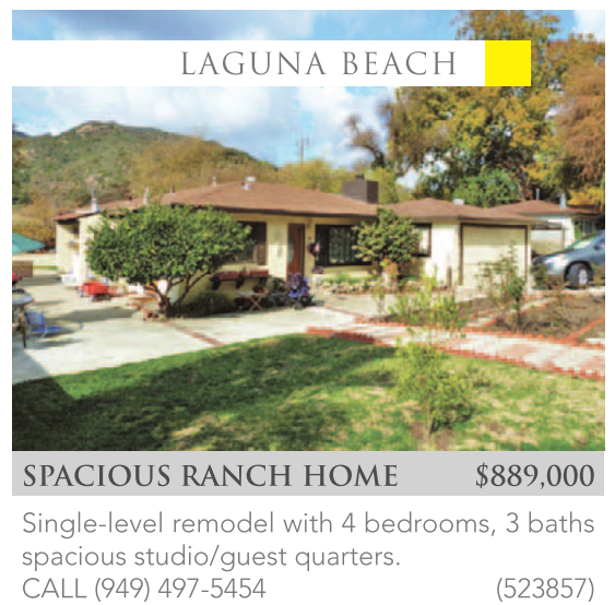 SPACIOUS RANCH HOME $889,000 Single-level remodel with 4 bedrooms, 3 baths spacious studio/guest quarters. CALL (949) 497-5454 (523857)