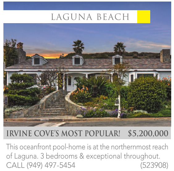 IRVINE COVE’S MOST POPULAR! $5,200,000 This oceanfront pool-home is at the northernmost reach of Laguna. 3 bedrooms & exceptional throughout. CALL (949) 497-5454 (523908)