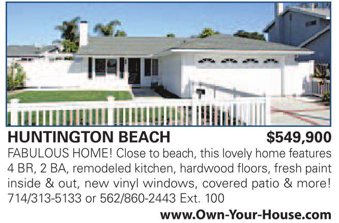HUNTINGTON BEACH $549,900 FABULOUS HOME! Close to beach, this lovely home features 4 BR, 2 BA, remodeled kitchen, hardwood floors, fresh paint inside & out, new vinyl windows, covered patio & more! 714/313-5133 or 562/860-2443 Ext. 100 www.Own-Your-House.com