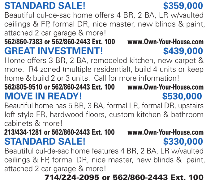 213/434-1281 or 562/860-2443 Ext. 100 www.Own-Your-House.com STANDARD SALE! $330,000