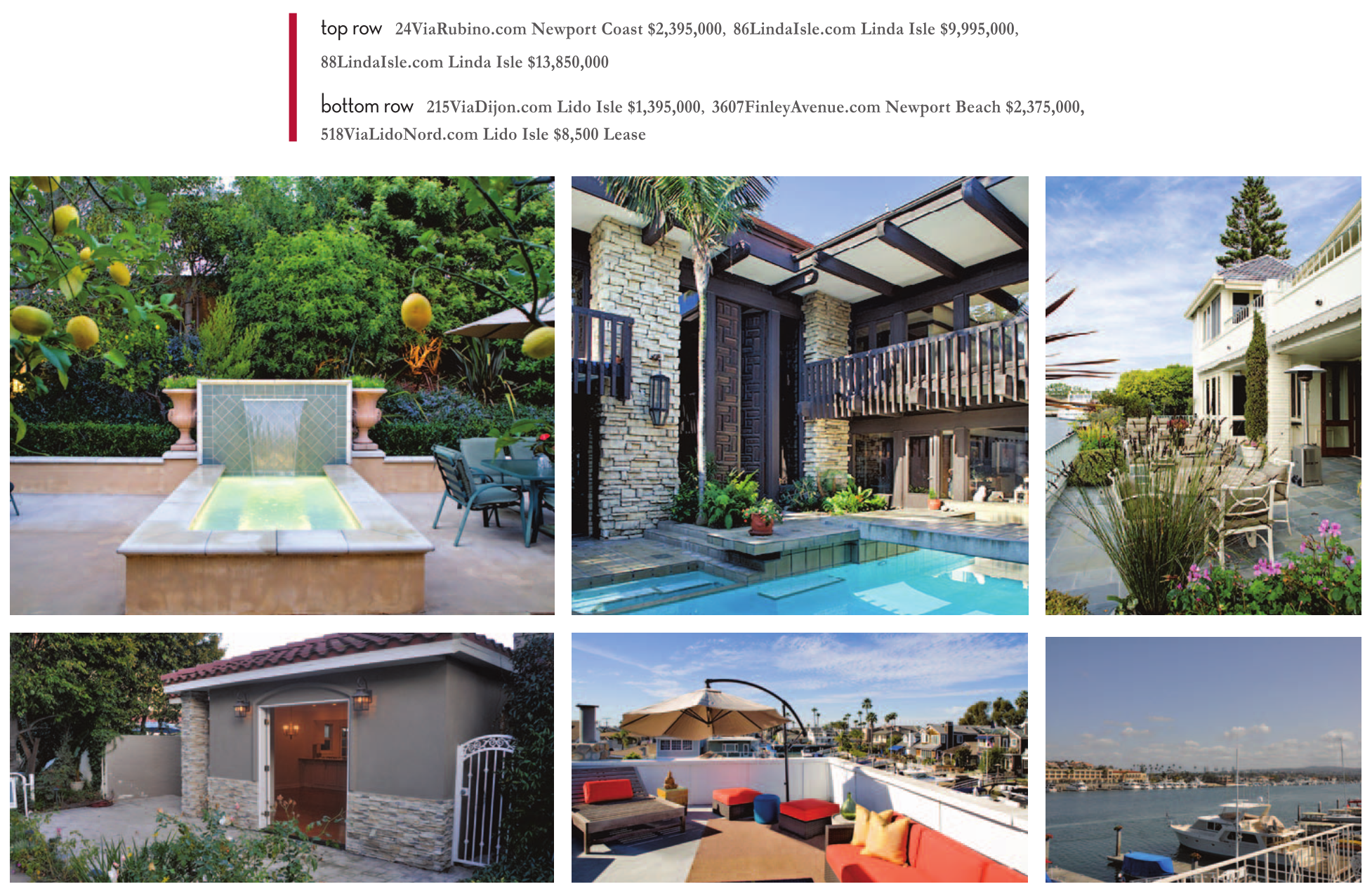 top row 24ViaRubino.com Newport Coast $2,395,000, 86LindaIsle.com Linda Isle $9,995,000, 88LindaIsle.com Linda Isle $13,850,000 bottom row 215ViaDijon.com Lido Isle $1,395,000, 3607FinleyAvenue.com Newport Beach $2,375,000, 518ViaLidoNord.com Lido Isle $8,500 Lease
